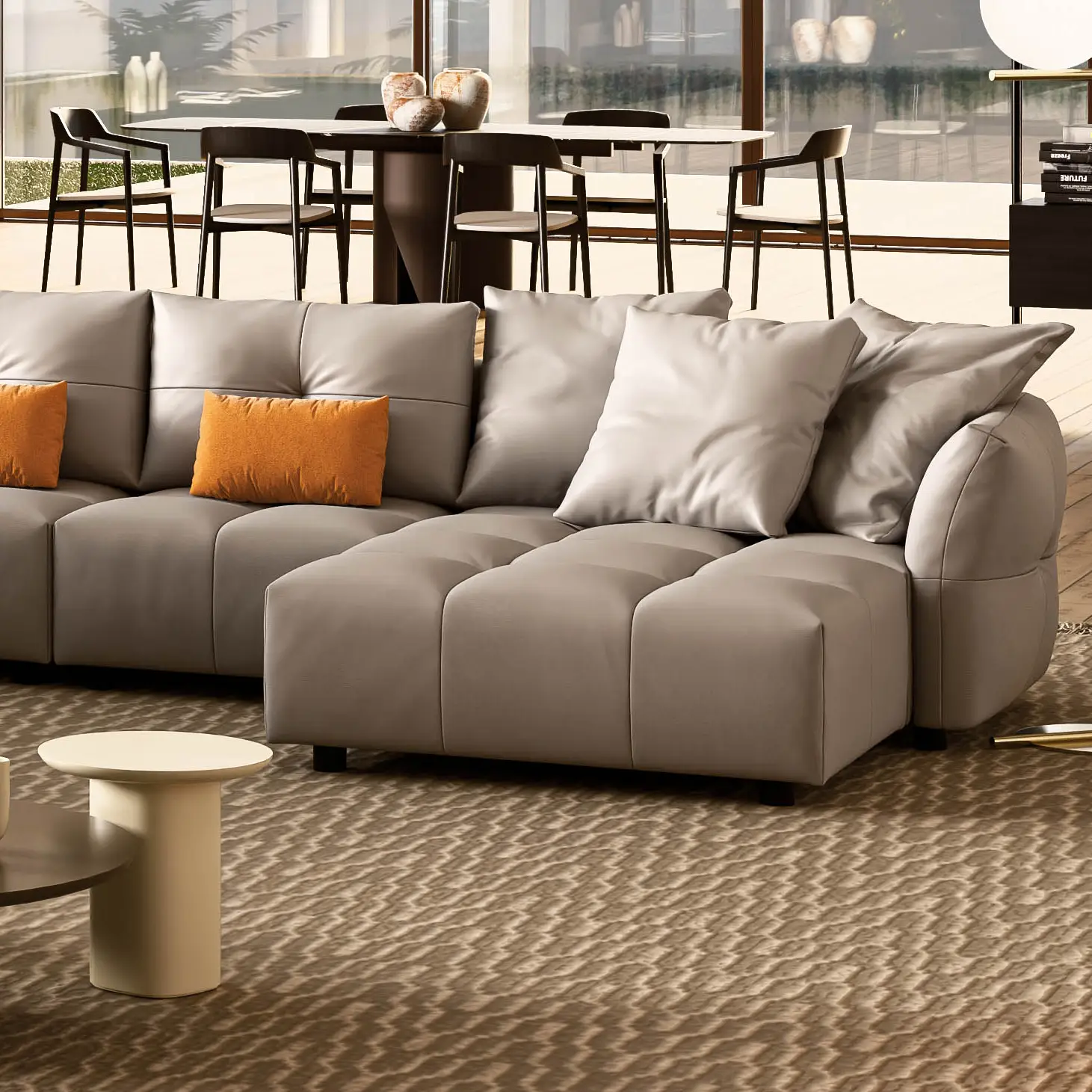 Il modello seduce con la sua comodità ed eleganza. Lo caratterizza l’attento studio delle linee morbide, l’imponente trapuntatura della seduta, la naturalezza di un bracciolo generoso ed ergonomico che abbraccia il divano e rivela un dettaglio “haute couture” sul davanti e poi la quantità di morbidi cuscini liberi che lasciano massima libertà di predisporre il proprio modo di vivere il divano, tutto questo fa di DUNE un partner unico di “comfort”.